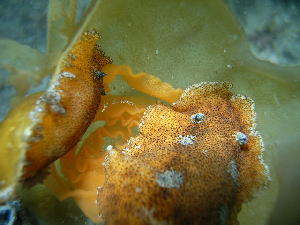 | まさに産卵中のカップルに出会いました! お花のようなヒダヒダが ウミウシの卵です! |