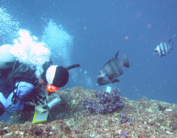 みなべのショウガセでは、 イシダイくんが、興味深げに寄ってきました! 「ねえ、ねえ、なに見てるの?」 埼玉からお越しのNさんフォトです! |