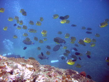イスズミ礁では、ニセカンランハギとチョウチョウウオが 玉になって、川になって ジャンジャン泳ぎ回っていました〜 奥は水底がうっすら透けて見えていますね〜 空を飛んでいるようで きもちよかったですよ。 |