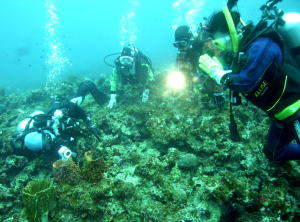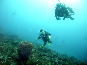 | Kさんがジット見つめるのは、 見ているだけで幸せになれそうな、 黄色いカエルアンコウちゃん。 スリバチカイメンに隠れていますよ。 |