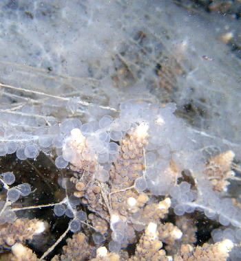 | サンゴの上に産みつけられていた、オキザヨリの卵です。 次回のチャレンジでは、サンゴの産卵が見られるといいですね。 |
