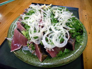 ツアー帰り道にて 名物のかつおのたたきをいただきました! つるつるモチモチの、最高のカツオでした! 普段なら食べないんだけど・・・ というNさんも、おかわりするほどの美味しさ! |