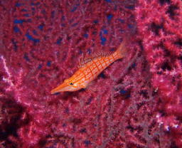 | 真っ赤なウミウチワについているクダゴンベは 背景もきれいで、より可愛らしさが際立ちます! |