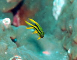 大人になるとすっかり姿を変えてしまう ヒレナガスズメダイの幼魚です! |