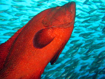 | 大迫力のアザハタの根! 群れ群れクロホシイシモチの中を泳ぐ姿は 圧巻です! |