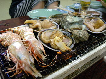 | アワビに、サザエに、ホタテに、エビに、イカに… 網の上にのせると まさに踊ってる〜っ!! 新鮮そのものの魚介類は本当に最高に美味しいです(*^-^*) |