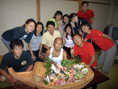 じゃじゃーん!!! 見て下さい、この巨大な舟盛りをっ\(◎o◎)/ タイに、イサキに、ヨコワに、カツオのたたきに、タコに、イカに、etc 大量のお刺身は最終的に、ほとんど食べつくされましたよ\(^O^)/ |