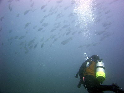 見て下さい、この魚影!!!!! 潜降したら、目の前にものすごい大群がやって来ました\(◎o◎)/! カンパチとツムブリ 100匹を越える大群でしたよ〜\(^O^)/ ピヨピヨチームの皆様も 見とれていましたね〜!! |
