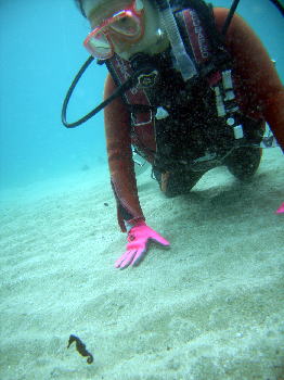 初めて海に潜ったFさん。 いきなりのご対面が タツノオトシゴ。 しかもあちこちにいっぱい! わぁ〜〜〜(*^-^*)すごい! |