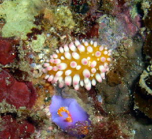 | わたしは初めて見ました! バライロマツカサウミウシ! しかも、卵らしいものが見えますよ(*^-^*) |