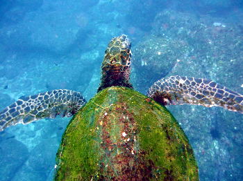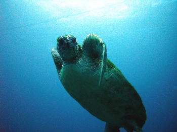 『なにか?』 と声が聞こえてきそうですね。 ばっちりとカメラ目線のアオウミガメです! 今回のツアーは 合計4匹のカメさんと出会えました〜♪ |
