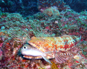 エソがガッチリ捕食したシーンをゲット! すごい写真です! スズメダイの目が切ない・・・ |