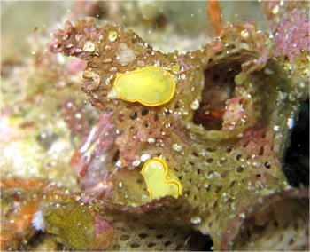 | 潜っているときに、なんだかゴミですか? と思ったら、 くっついていたのは ミツイラメリウミウシ! 小さいのにきれいに撮れました! |