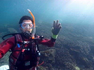 | そして串本ブルーの中、Hさんが☆☆100本記念☆☆ 目標の完璧な潜降!!大成功でしたね〜♪ 200本目指して、もっともっと楽しんでいきましょうね(o^_^o) 200本記念の目標はマスク脱着!? |
