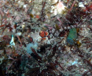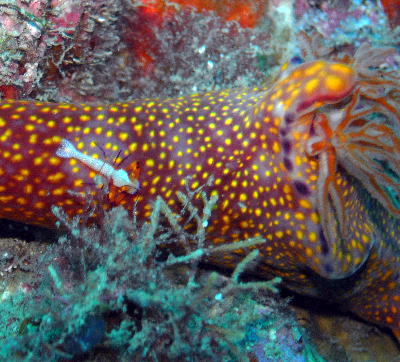 | ニシキウミウシの背中に乗っていたバルタン星人☆こと ウミウシカクレエビ!! 色鮮やかなキレイなエビさんです(^‐^) フォト派の皆さんには最高の被写体ですね〜♪ |