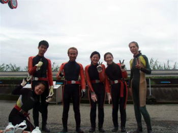 | 体験ダイビングの皆様です! 先輩ダイバーといっしょに、ハイチーズ! 今のところ笑顔ですね!ハイ! |