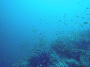 | 根の周りにはキンギョハナダイが乱舞o(^o^)o 全員でキンギョハナダイになりきった気分で キンギョハナダイに混じって水中を泳いできました〜! |