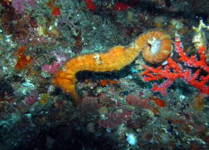 おっきなタツノオトシゴの仲間『オオウミウマ』です! 縦ではなく横向きで姿勢をキープ!! すごい腹筋の持ち主なのでしょうか? |