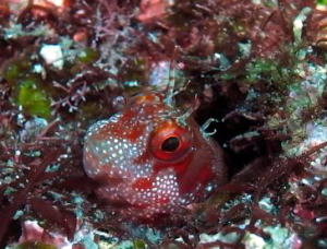 | マツバギンポさんもちょこんと顔を覗かせていました♪ 小さい体でかわいらしさも持っているのに、 番人のようなたくましさも持っているように見えますよ(o^_^o) |