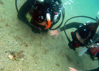 | 講習終了後、ウネリのある海に初のファンダイビングへ〜〜 すると、昨日『へんないきのもの』の本でチェックした カエルアンコウを自分で発見しちゃいました(o^_^o) エスカ振りまくリで、私達も大興奮♪♪ |