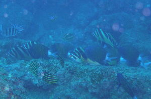 なぜか岩の上で一列に整列して休憩中のお魚達・・・・ 前日のウネリで疲れたんでしょうか(*_*) 穏やかになった海で、ゆっくり休んでね! |