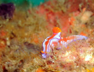 草原を歩いているようなニシキウミウシ♪ この子は色が変わりかけ! 近くにはキレイに赤色に変身した 大人のニシキウミウシもいましたよ! |