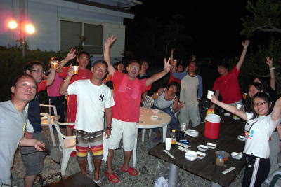 | BBQ上も大人数で大盛り上がりです! 皆がとっているポーズ、 『エア切れ』?!『アイーン』?!どっちでしょう(*^_^*) ダイバーの集まりだから・・・ お分かりですよね?! |