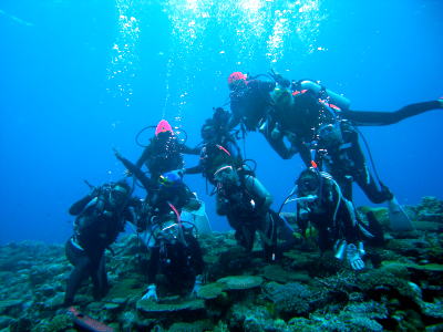 | そして、水中でも5レンジャーと共に 記念撮影です! 青い海、大物に、サンゴに、癒される砂地 思いっきり満喫の4日間でした! |