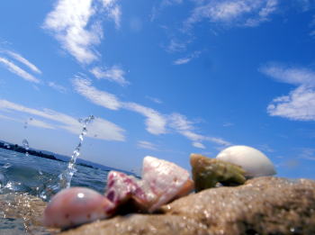 Mちゃんは休憩中に 水底に落ちている貝殻を拾ってコレクション! パリコレならぬ貝殻の『Mコレ』完成ですo(^o^)o それにしても、いいお天気です〜〜 |