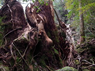 | こちらは今年の9月に倒れてしまった翁杉 ばったりと向こう側に倒れこんでいるのが わかるでしょうか? 2000年という長い歳月、お疲れ様でした! そして、この上にまた新たな命が芽生えるのです♪ |