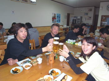 | 夜は美味しいお食事と共に、ビールで乾杯! 至福のひと時です。 この一瞬が一生! Mさんの名言です! |