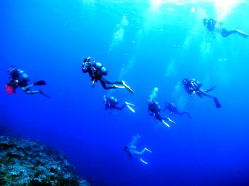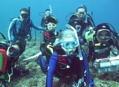 | 水中で記念撮影! 右端のTさんが持っているのは 水中で3D写真が撮影できる 機材です。 大阪の万博からかれこれ・・・・ とにかくスゴイ方です! 自分で設計作成されているんですよ! |