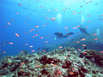 魚がたっぷりなのも、久米島です。 アカネハナゴイやキンギョハナダイが とっても賑やか! |