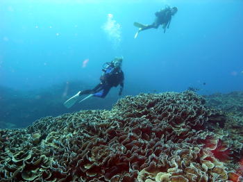意外なリュウキュウキッカサンゴの群生です。 先日ニュースになった、久米島南部の サンゴの群生地は、やや水深が深め。( 〜25m) ココは水深15mくらいです! |