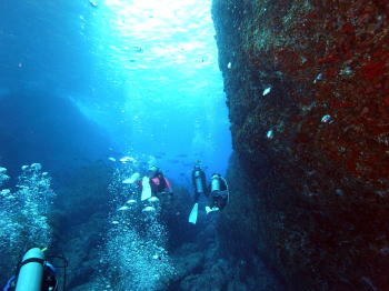 | 1本目は、ジャックポイントというポイントへ! 地形がダイナミック!!! そして海がさらにブルーの濃度をあげています! 岩に打ち付ける波間に ちらちらアオウミガメが見え隠れ。 波にもまれて遊んでるの? 4匹も集まってきていました! |