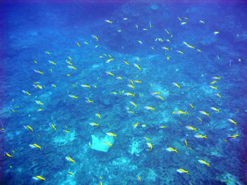 ![]() ダイビングとダイビングの間の休憩時間。 スノーケリングも楽しめちゃいます! 足元には、ぎっしりのサンゴと ウメイロモドキの乱舞! |
