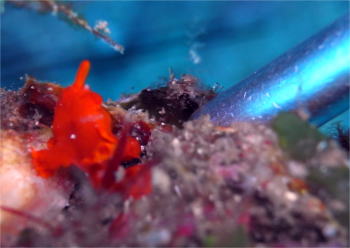 | チビチビのイロカエルアンコウ! 右側の指示棒を見ると その小ささがわかりますよね〜 ちょいちょいちょいと、動き回るので なかなか正面を向いてくれませんでした。 |