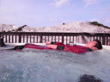 「あ〜〜〜〜きもちええ〜〜〜〜」 合間のジャグジー風呂、気持ちいです♪ 上を見ると青空が! |