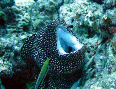 | 大きな口をあけてお掃除してもらってますね(^○^) 凶暴なウツボのことのときばかりは 甘えん坊になります! |