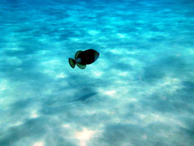 真っ白な砂地に1匹のゴマモンガラ まるで卵を待つ家路を急ぐような さっそうとした姿です! お魚の影まで砂地に写っています♪ |