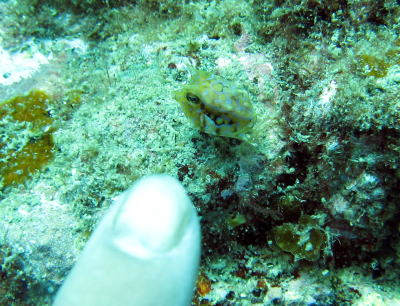 | 備前に登場のモンガラカワハギの赤ちゃんです! すこーし頭が黄色くなりかけてますが まだまだ可愛いちびっこちゃんですよぉ(^_-) |