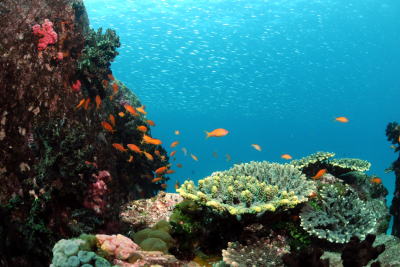| サンゴのまわりにはお魚が群れ群れ(^_-) ブルーの海に キンギョハナダイのオレンジがとってもキレイ!! |