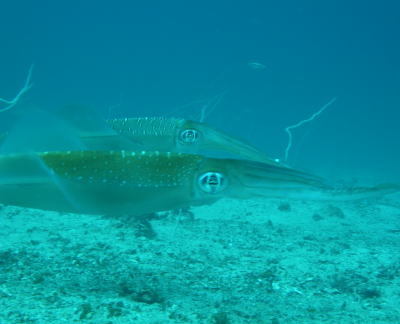 | おっとっとっと〜〜(@_@) アオリイカにも大接近ーーーー!!! 体の色を変えたり、目もギラギラしてます!! |