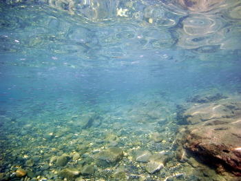 | ビーチのエントリー口はこんな感じ・・・ 潜らにゃソン、ソン! 良く見ると、キビナゴがざ〜っと泳いでいます! ちょっと見づらいかな。。。 |