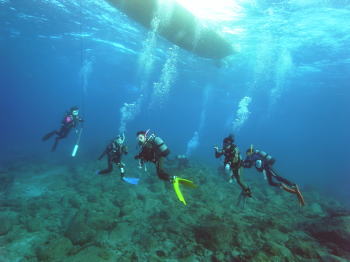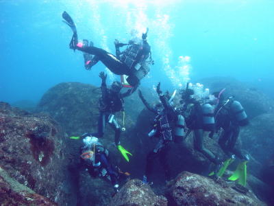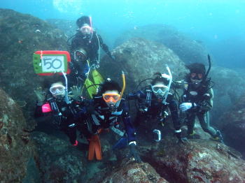 | 柏島4ダイブ目で、Iさん50本記念です! おめでとうございます〜! オレンジのマスクのOさんが記念みたいですが 「50」の下の方が Iさんですよ。 |