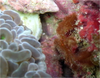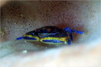 これまたスリバチカイメンの隙間で ちょっぴり見づらい 青いカニダマシ。 色がほんときれいです! |