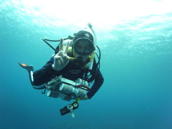 | そして自作の3D水中カメラを手に潜る Tさん! 84歳の水中生物?!です!!! |