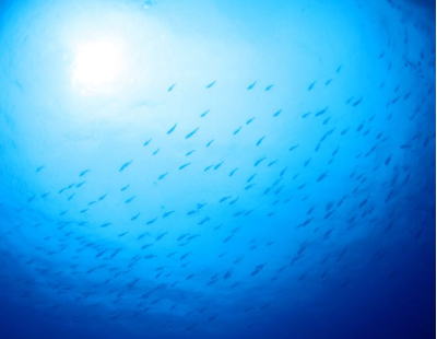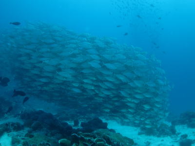 最終日は早朝集合でブルーコーナーへ! 1本目はなかなかいい感じの流れ♪ そこにはマダラタルミの群れに ギンガメアジの渦です! |