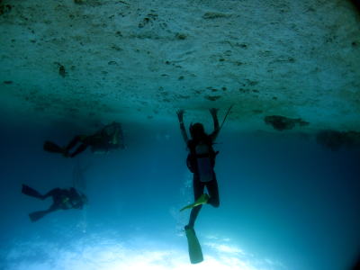 初日のウーロンチャネルでまずはサメウォッチング〜! 頭上を通り過ぎるサメを激写中のSさんです! |