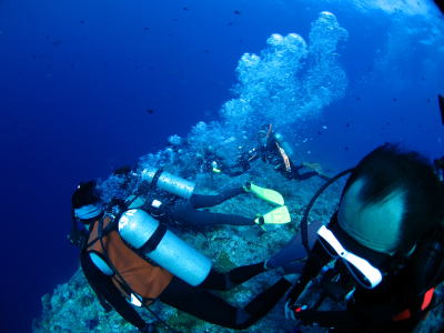 | カレントフックをかけて 行き過ぎるサメやら大物達を眺めます! 皆さんのエアーと、なびくパパの髪で 流れの激しさが伺えるでしょー(^_-)-☆ |